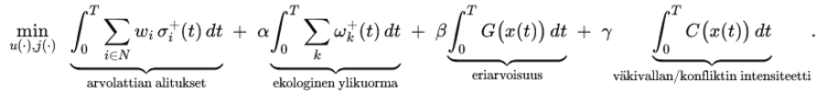 Sen ”kaikenteoriassa” kaavat ovat tavoitefunktioita, kuten tässä minimoidaan ajan yli sosiaalinen vaje + ekologinen ylikuorma + eriarvoisuus + väkivalta, eettisellä prioriteetilla: