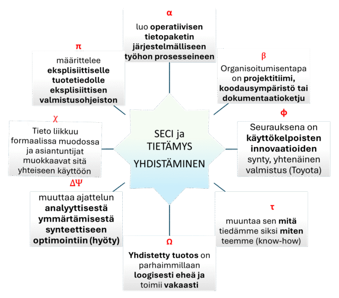 Se integroi Deklaratiivisen tiedon Algoritmiseen/Proseduraaliseen tietoon. Se toimii ratkaisevana vaiheena, joka muuttaa mitä tiedämme miten teemme. Ulkoistamisen tuotos (spesifikaatio) on input, ja Yhdistämisen tuotos (toimiva koodi/prosessi) on seuraavan vaiheen Internalisaation input.