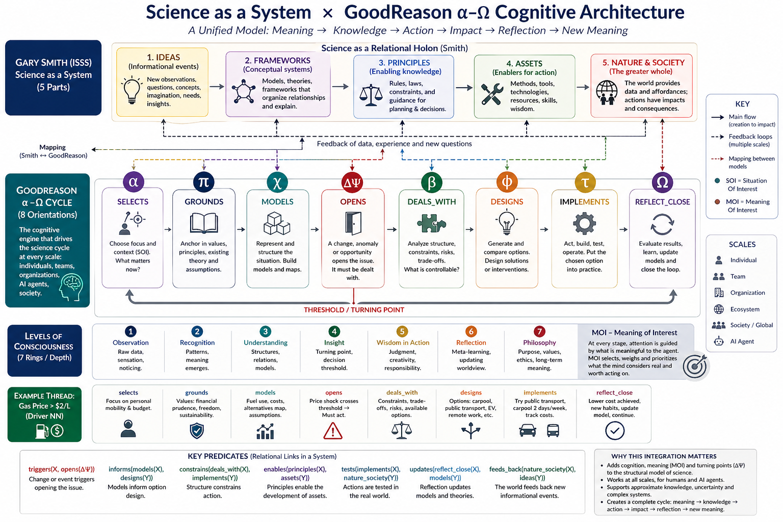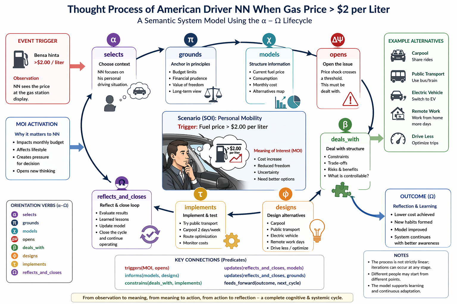 EKI: Voimmeko mallintaa ajatuksen kulkua tilanteessa, kun amerikkalainen autoilija NN huomasi, että bensan hinta on noussut yli 2 dollaria per litra? Voidaanko käyttää näitä juuri kuvattuja verbejä, joiden mukaan hän tutkii itseään, kyseenalaistaa aikomuksiaan, mitä voisi tehdä, ja mahdollisesti pohtii jakeluverkostoa tai muita kulkuvälineitä ratkaisuina? Olisi kaunista, jos voitaisiin muuttaa ainakin joitakin arkisia ajatuksia symboliseen muotoon ja kuvata yhteyksiä predikaatteina tukemaan systeemiajattelua!