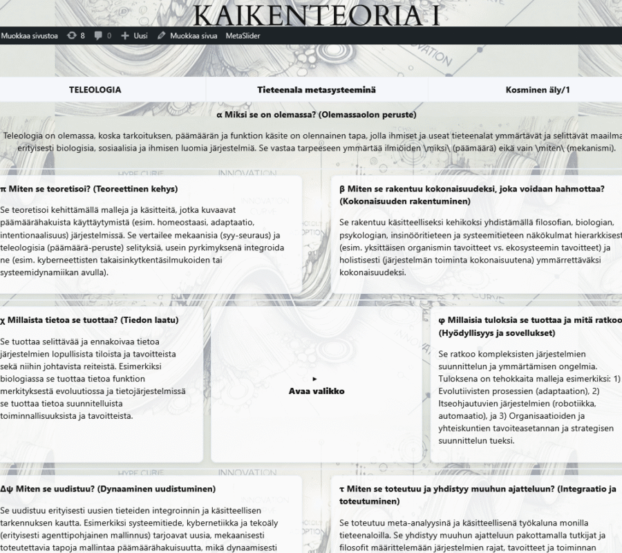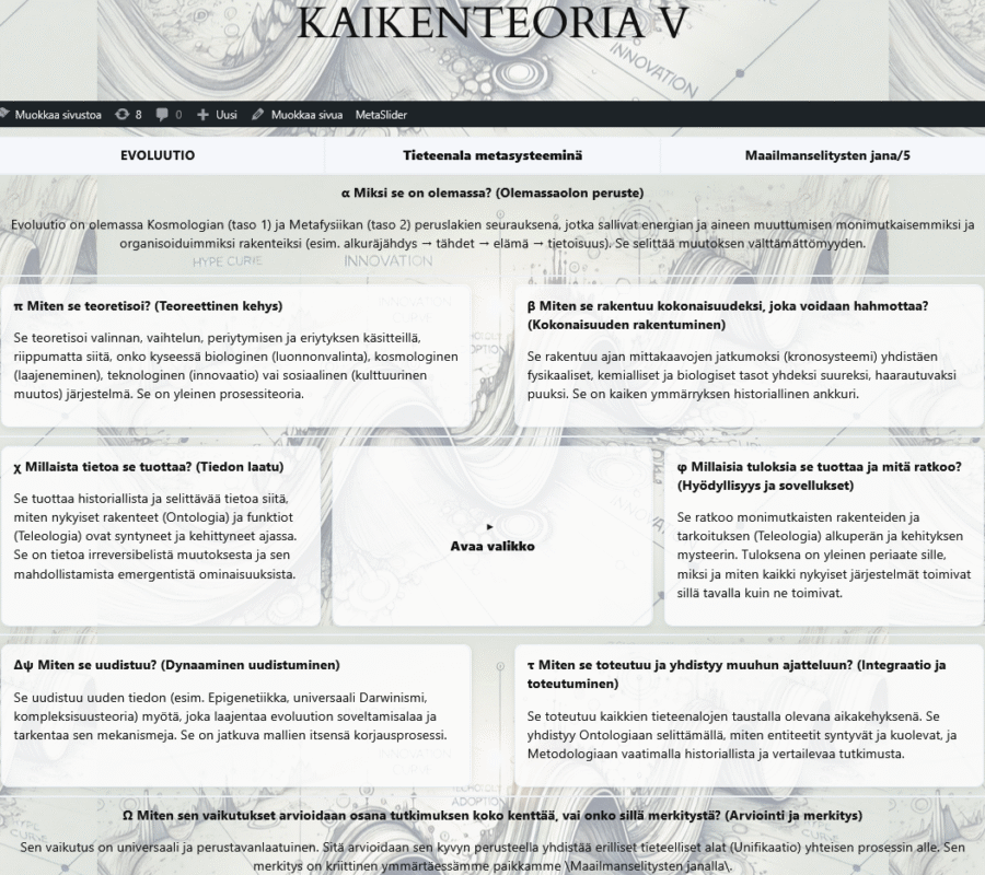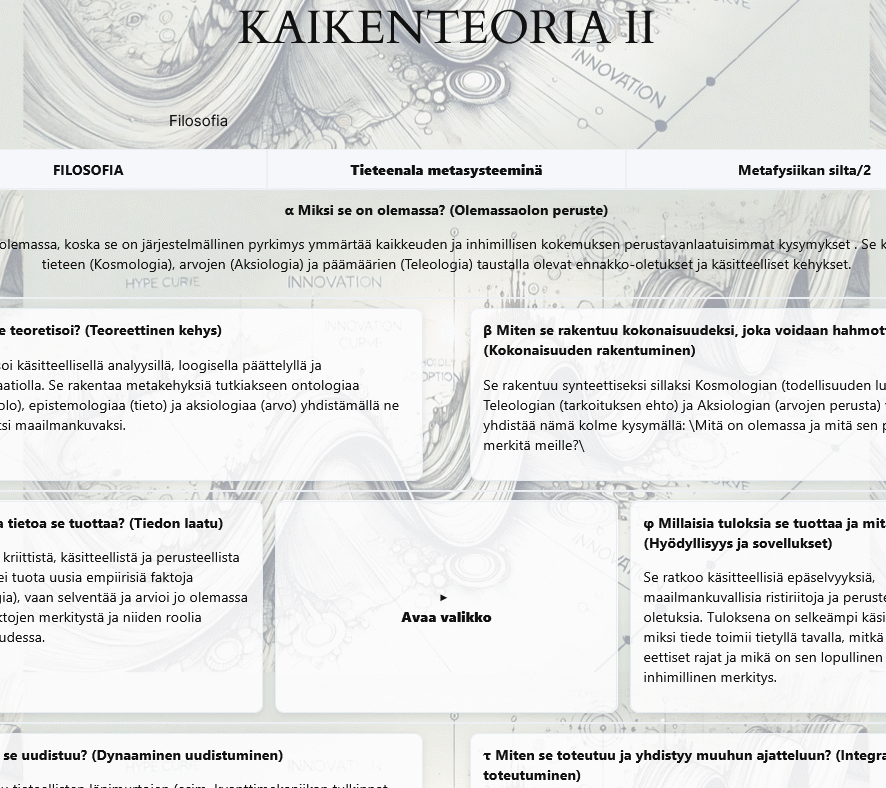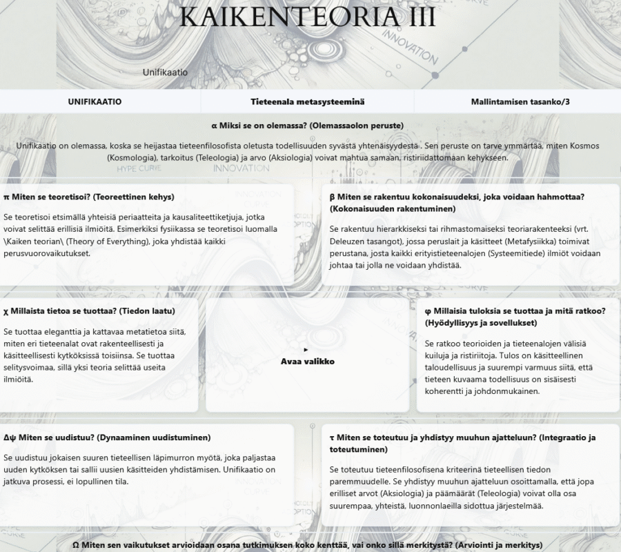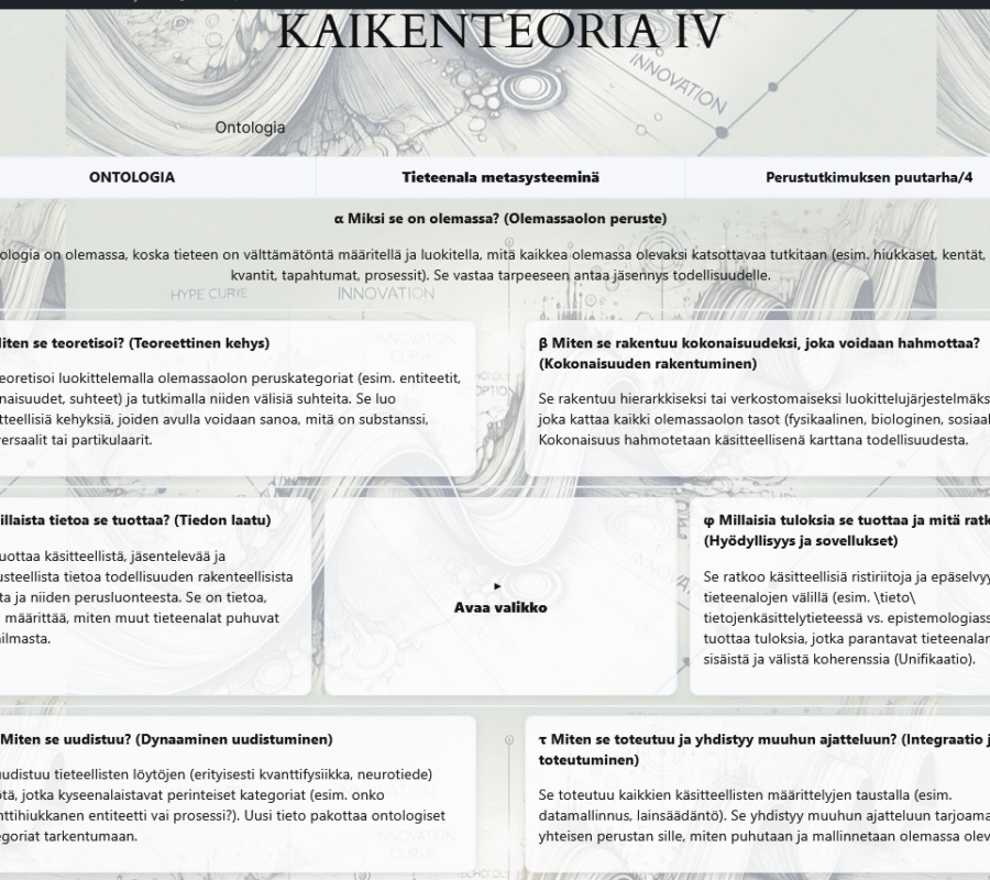 JSON:lla piirretty alkuteoriakaavio kuvaa universaalia tieteen viitekehystä. Symboleita klikkaamalla pääsee niiden ominaisuuksiin.