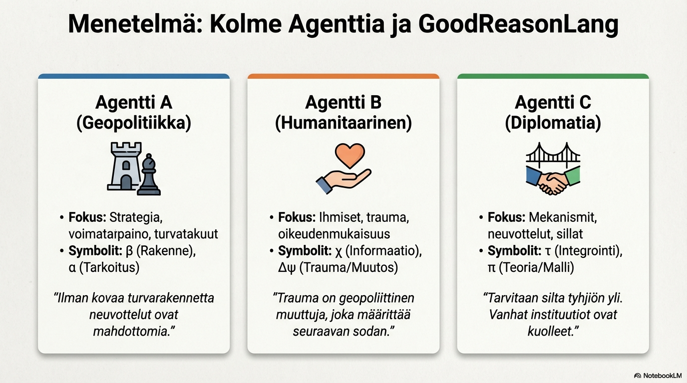 Ville Laitila laati yllä olevan viitekehyksen: kolme agenttia ja niiden vaikutus Ukrainan kriisiin, kun viestinnän välineenä käytetään sekä normaalia kieltä että GoodReasonin omaa symbolista logiikkakieltä, joka sisältää kahdeksan symbolia α – Ω. Podcastin voi kuunnella alta ja sen alla on PDF-tiedosto, Powerpoint – esitys keskustelun ja päättelyn kiinnekohdista runsaine kuvituksineen.